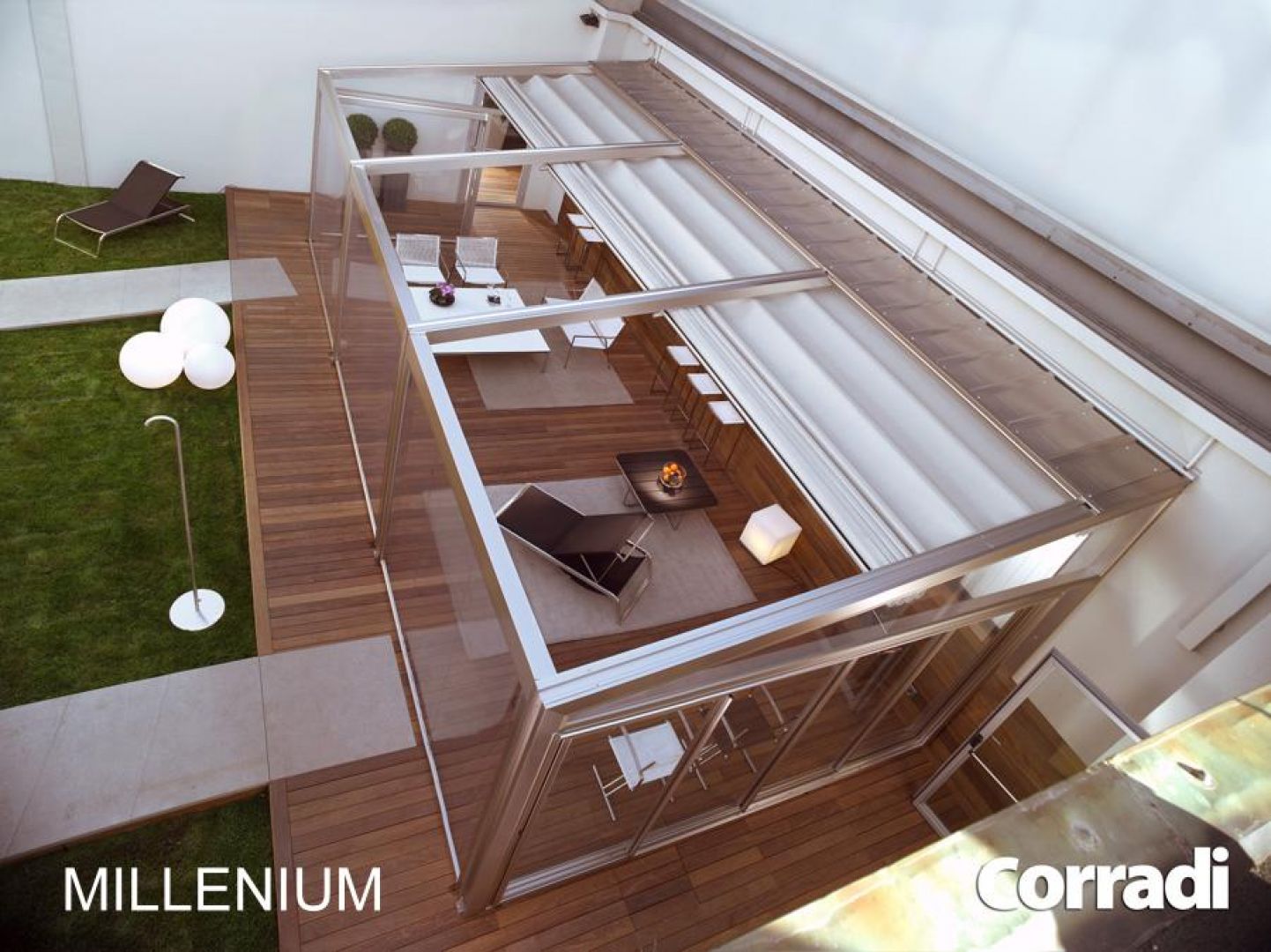 Struttura in alluminio ancorata ad una parete di supporto, brevettata a sole pioggia e vento, t essuto eclissi, puo essere in piano o inclinata, tettuccio di protezione ,accessoristica in acciaio inox. Struttura nei colori aluinox, bianco ed antracite.