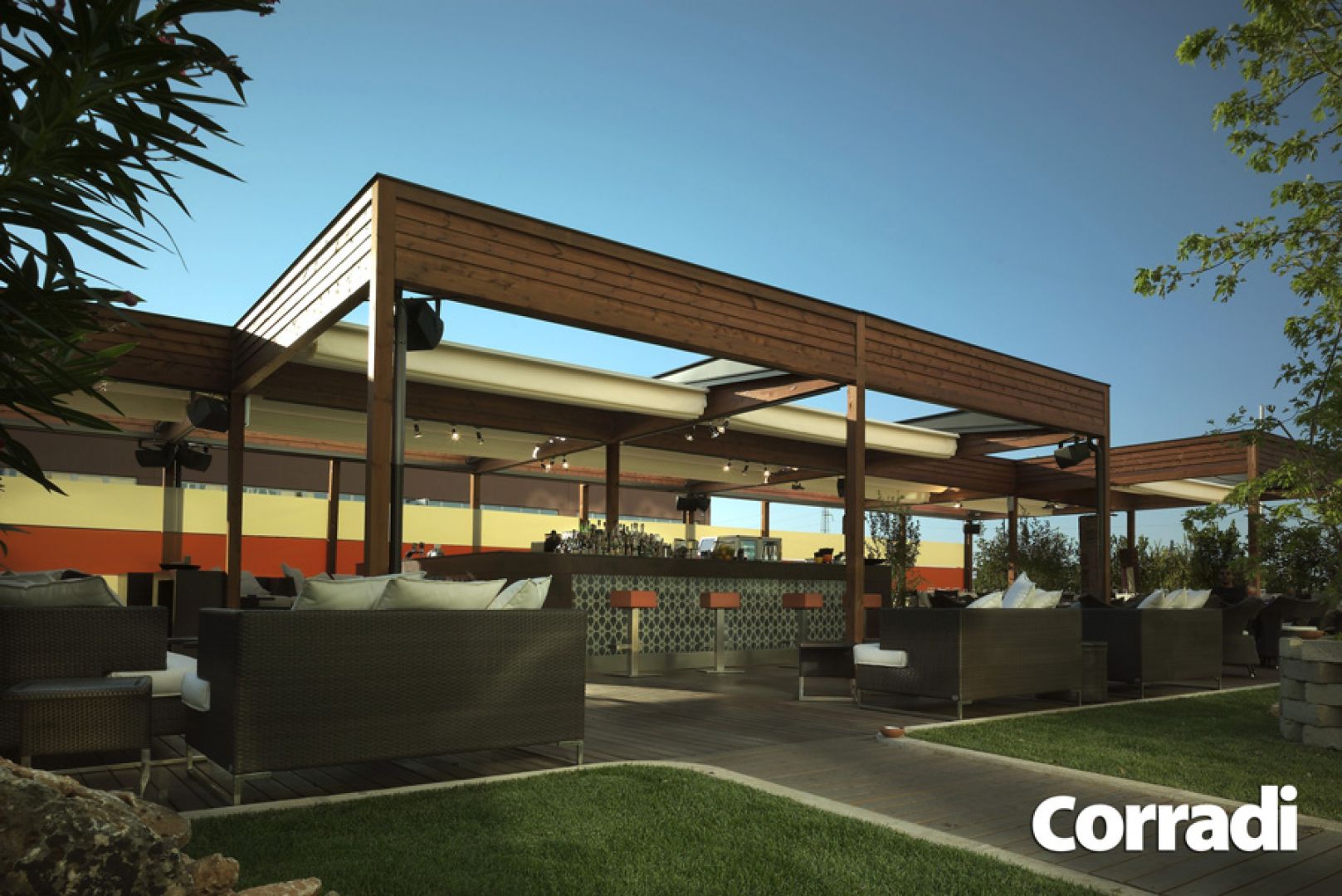 Autoportante, modulare, in piano o inclinata, struttura in legno con pannelli superiori perimetrali a copertura del telo.