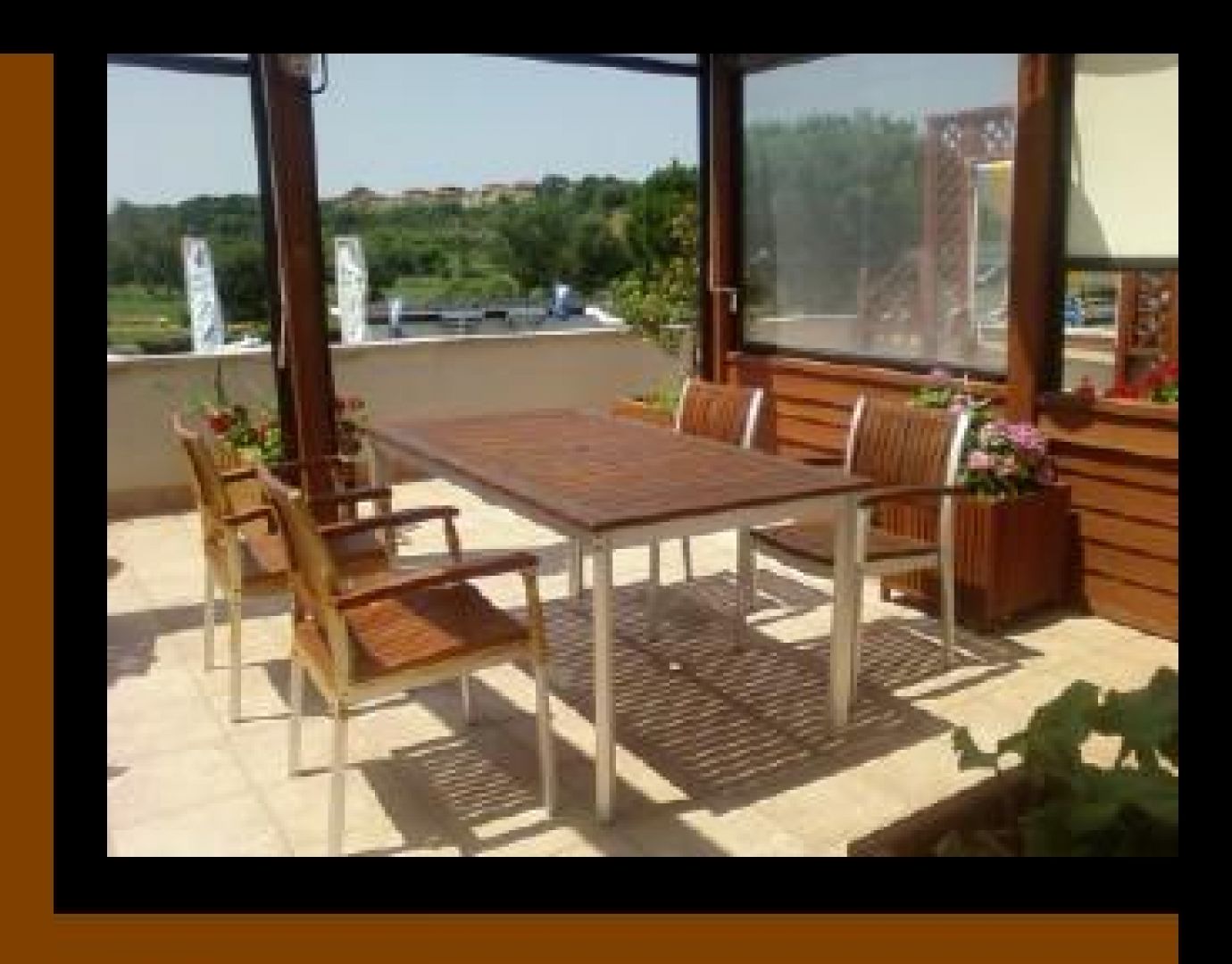 tavolo legno rettangolare 90x160 con foro per ombrellone gambe in allumio color argento.N°4 poltrone 60x55 impilabili medesime caratteristiche ,finitura legno scura. € 550