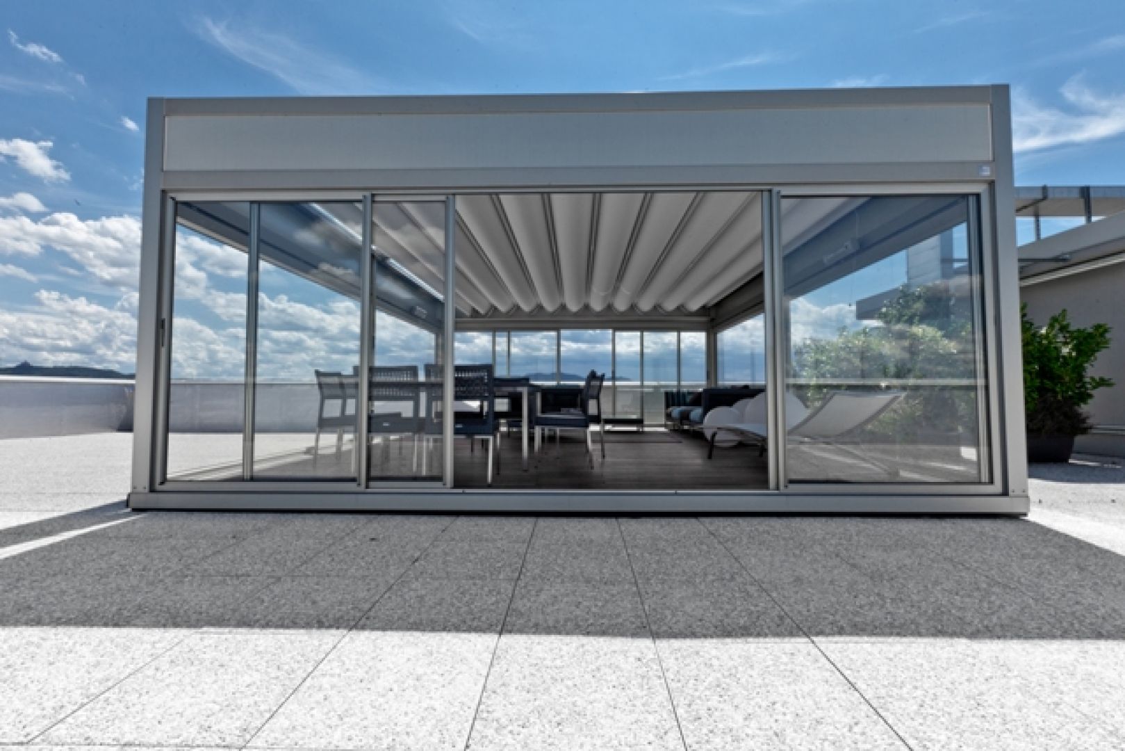 pergotenda AUTOPORTANTE IN ALLUMINIO ,CON TIMPANO IN OPALINO BIANCO E TELO DI COPERTURA IN PIANO.