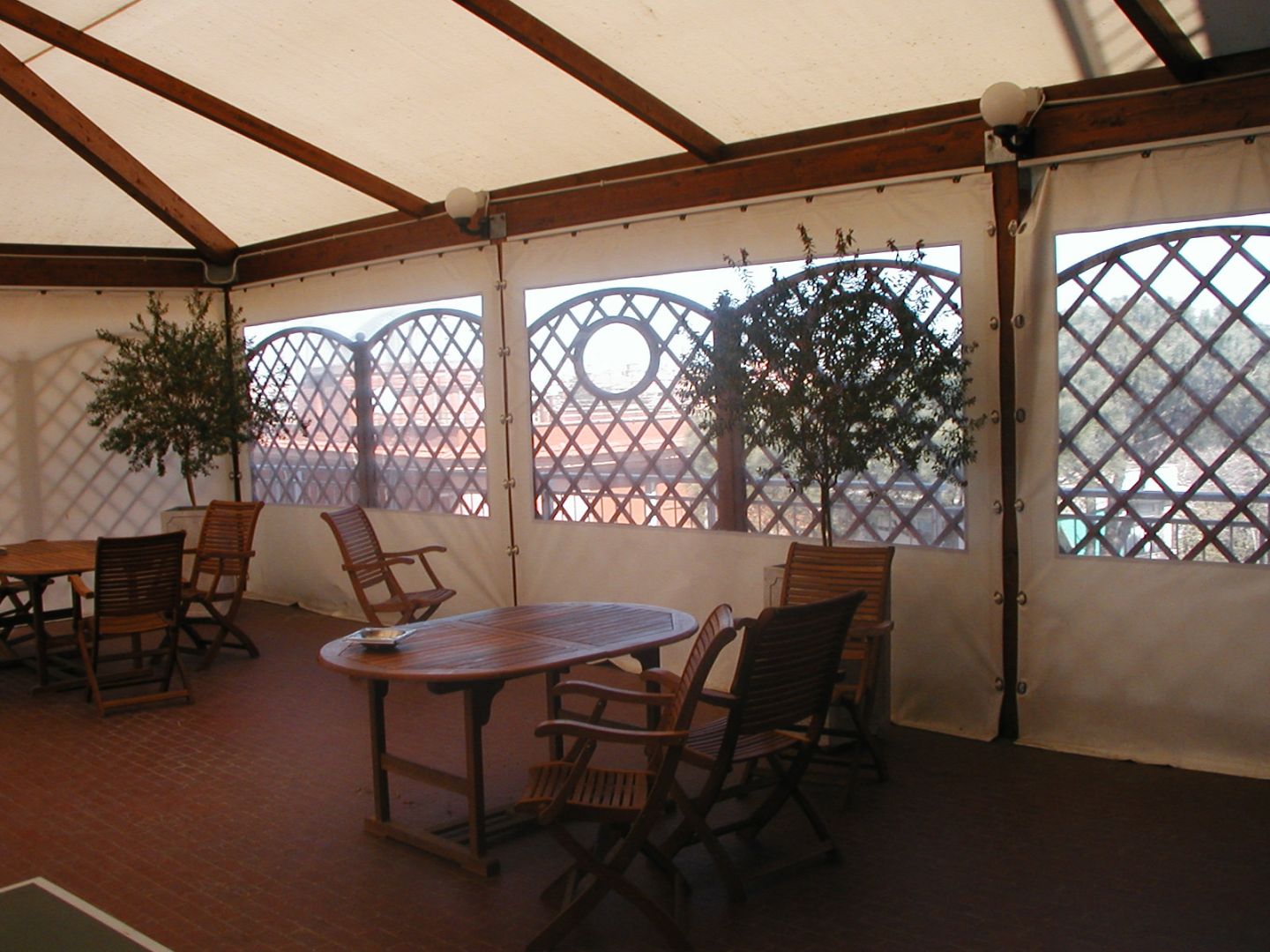 Teli in pvc scorrevoli, impacchettamento laterale, fissaggio con cavallotti girevoli.