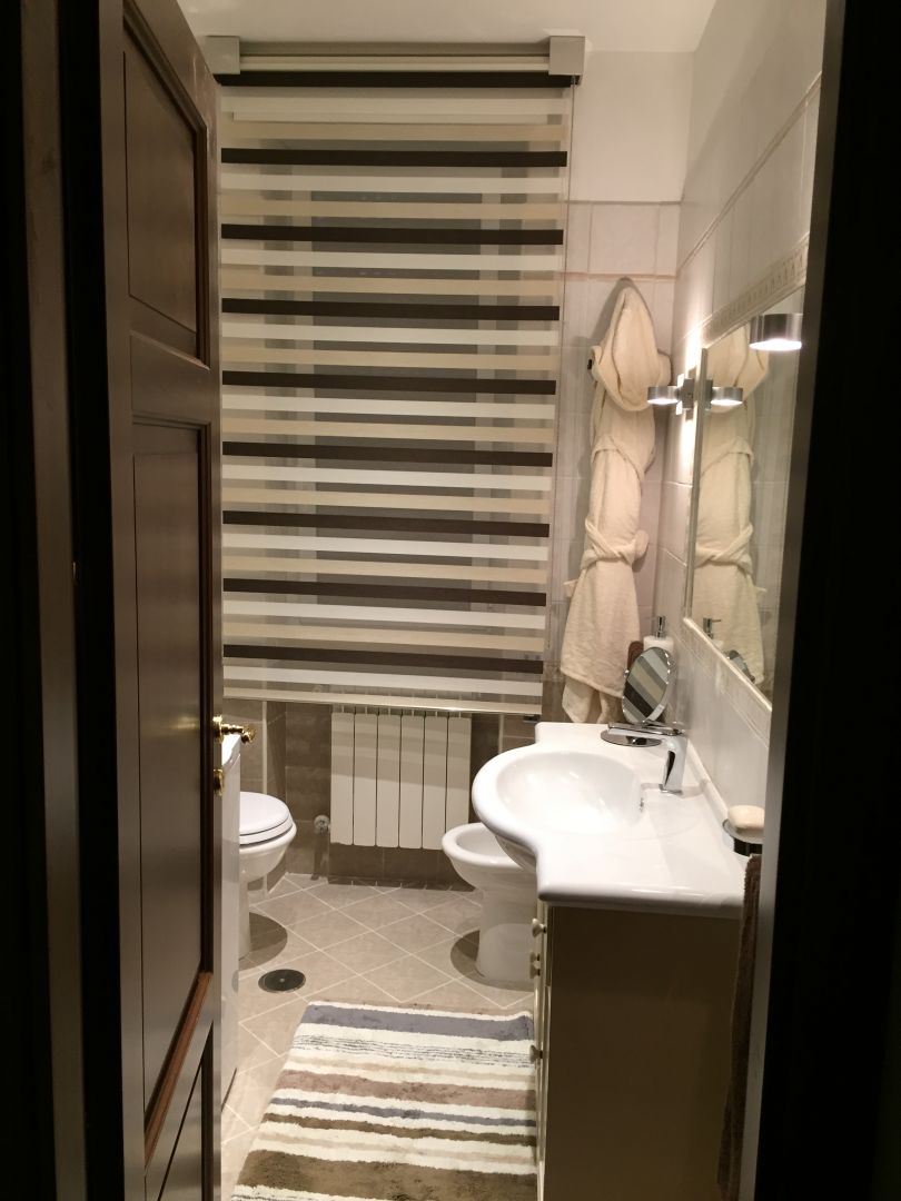 la tenda protagonista ,elemento che valorizza il bagno