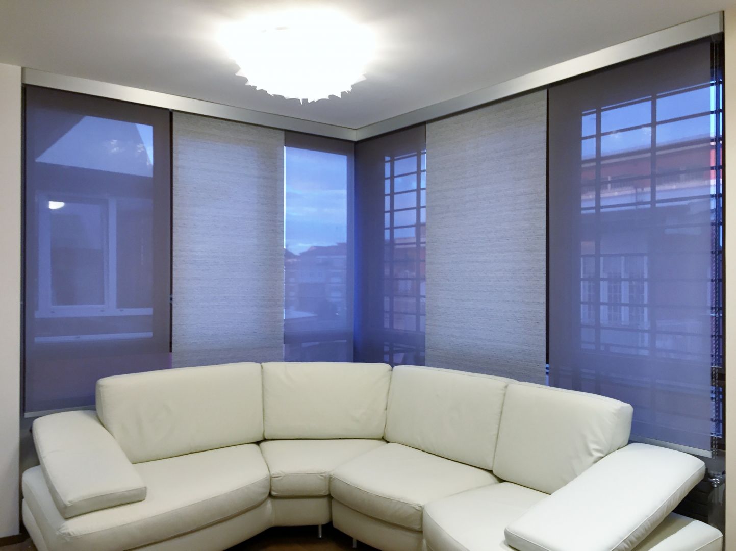Unica mantovana angolo in alluminio che copre i meccanismi, e un gioco di tessuti con diversi gradi di filtraggio movimentano l'atmosfera.