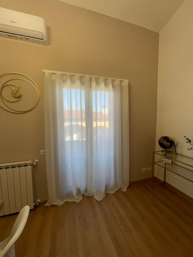 Il bianco che risalta sui toni tortora di questa parete, dona luce e un tocco di leggerezza a tutto il salone....