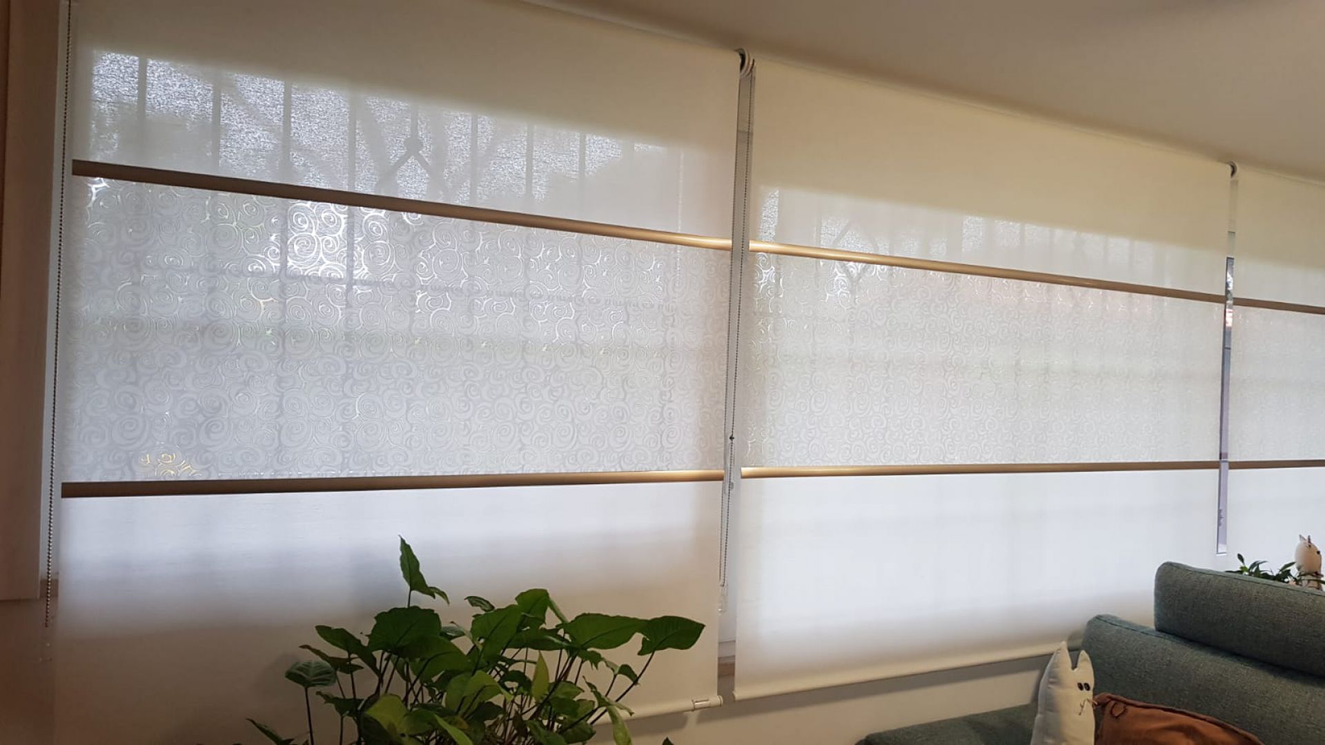 Tende a rullo con tessuto bianco screen e tessuto con fantasia devorè abbinati, definiti da steccatura in alluminio