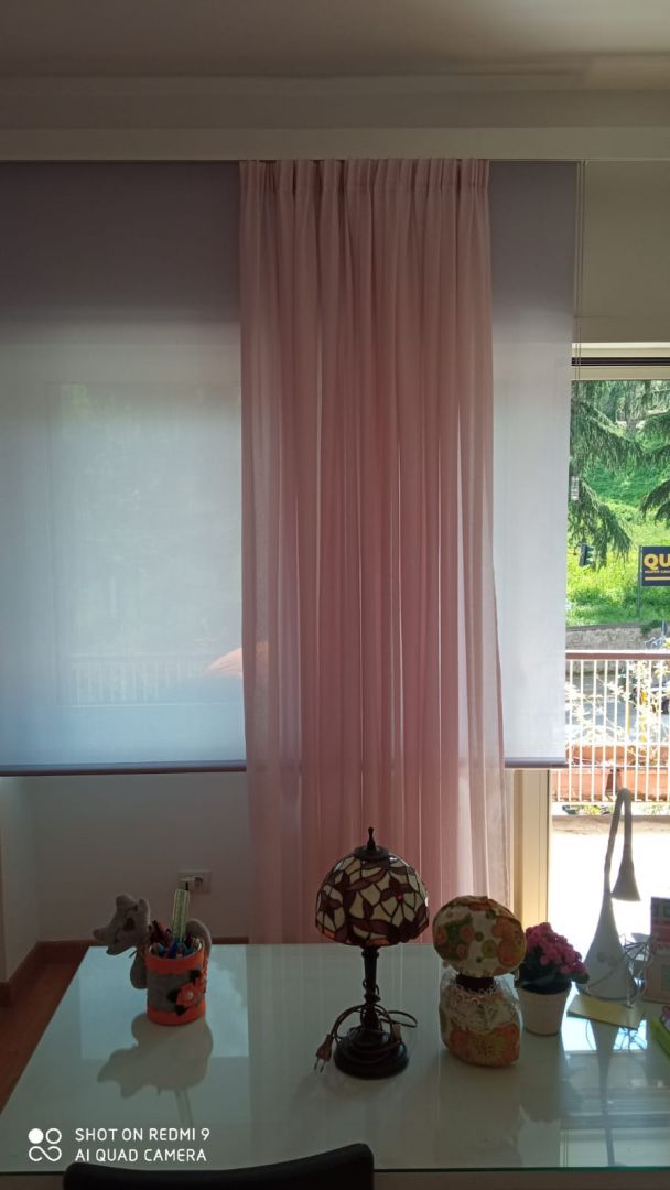 Tenda a rullo abbinata a tenda morbida, il tutto rifinito da una mantovana in alluminio decorativa