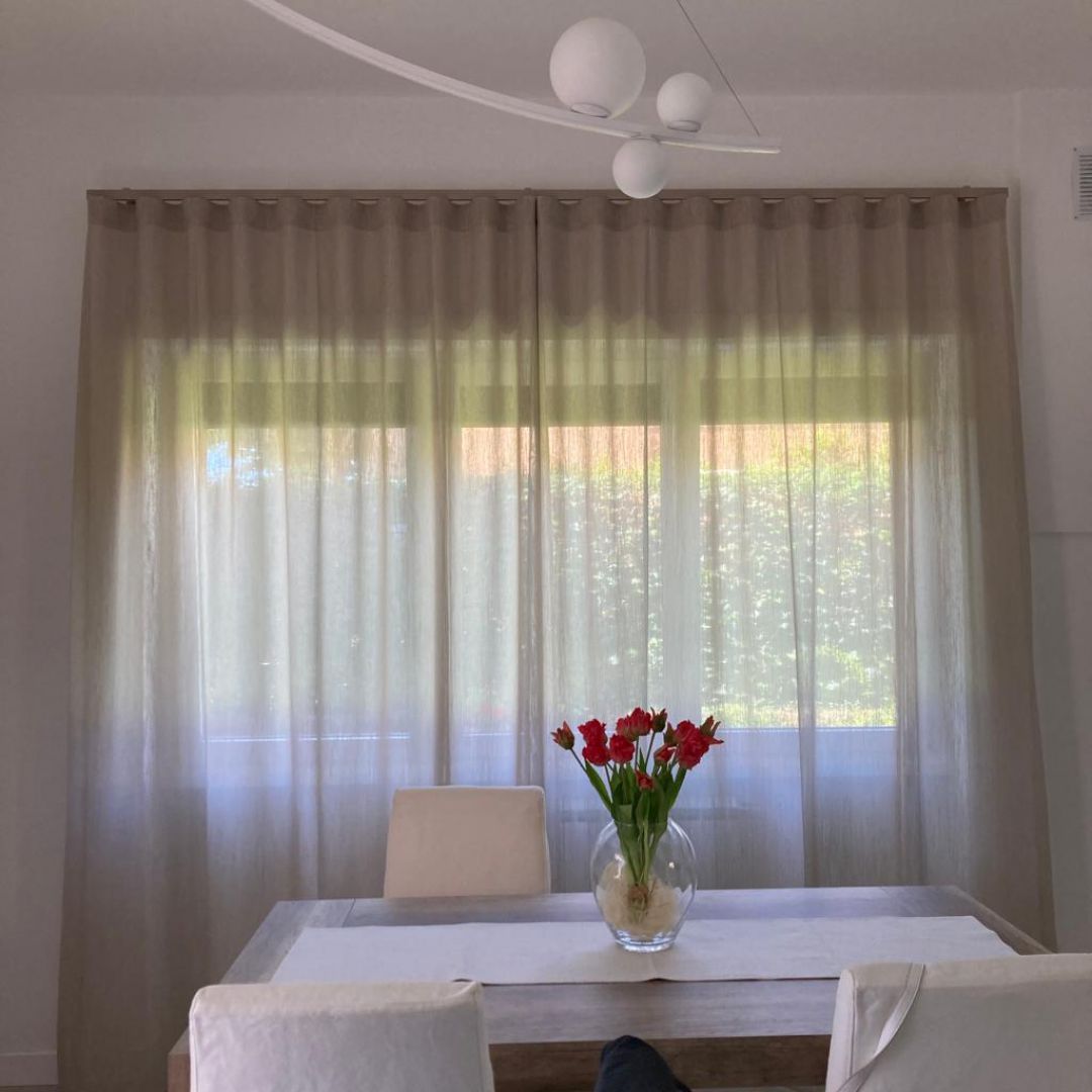Tenda confezionata ad onda, tessuto in misto lino, binario decorativo tortora installato a parete....